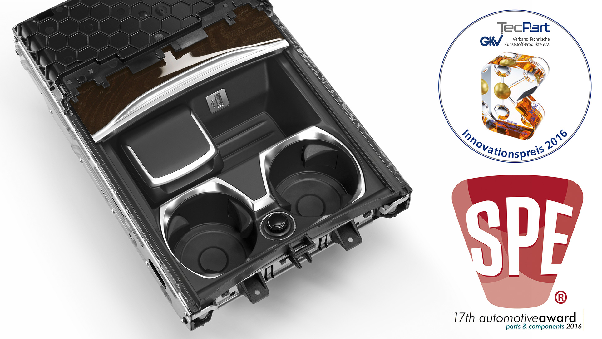 2016: Car interior innovation: Centre console storage compartment / cupholder unit with double-layer 2-stage sliding lid